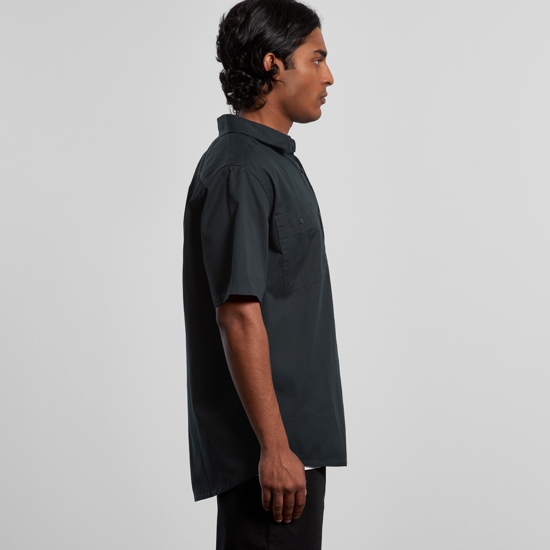 Short sleeve button up shirt, two chest pockets with pen channel, tonal buttons, side seamed, back yoke with hang loop, preshrunk to minimise shrinkage.